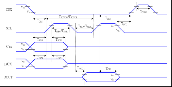 ATK-MD0130和ATK-MD0240模块在四线SPI通讯模式下,最少仅需四根信号线(CS、SCK、SDA、WR(DC))就能够完成与这两个显示模块的通讯,四线SPI接口时序如下图所示。