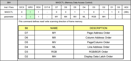 表16.1.2.1 命令0x36配置LCD扫描方向