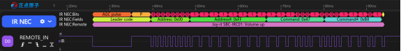 红外载波信号其实就是由一个个红外载波周期组成。在频率为38KHz下,红外载波周期约等于26.3us(1s / 38KHz ≈ 26.3us)。在一个红外载波发射周期里,发射红外光时间8.77us和不发射红外光17.53us,发射红外光的占空比一般为1/3。相对的,整个周期内不发射红外光,就是载波不发射周期。在红外遥控器内已经把载波和不载波信号处理好,我们需要做的就是识别遥控器按键发射出的信号,信号也是遵循某种协议的。
