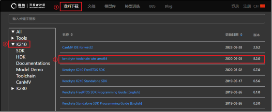 我们到嘉楠开发者社区下载(https://developer.canaan-creative.com/resource),依次点击资料下载→K210,选择我们要下载的kendryte-toolchain-win-amd64,如下图所示: