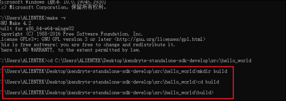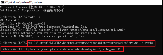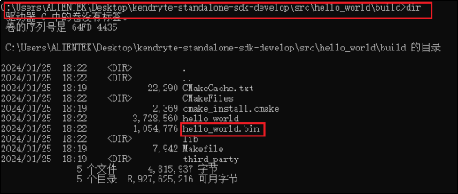 这个程序就是使用双核打印输出Hello world,有一个核心额外执行读取外部输入整形数据再打印,这里我们先不多介绍,我们现在要将它编译输出一个.bin文件,我们用命令cd进入到hello_world文件夹,如下图所示: