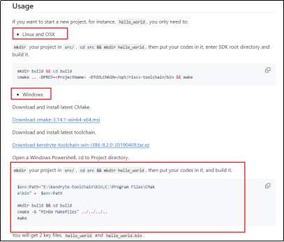 首先我们可以打开GitHub上的链接:https://github.com/kendryte/kendryte-standalone-sdk,下拉到下方README,可以看到有Linux、OSX和Windows下的编译示例,如下图所示: