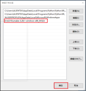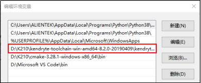 点击新建后,我们点击浏览,然后找到我们存放的CMake文件目录,选择文件夹下的bin文件,然后点击确认,此处的路径是:D:\K210\cmake-3.28.1-windows-x86_64\bin,如下图所示: