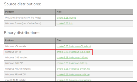 CMake官方下载地址:https://cmake.org/download/,我们这里以Win 10 64位系统安装CMake的过程为例,如下图所示: