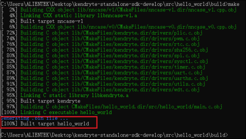 接着输入make,按回车开始编译,编译需要一段时间,耐心等待,如有错误会出现红色字体导致编译不成功,等待编译到100%,提示Built target hello_world,说明编译已经完成了,如下图所示: