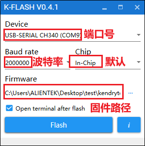 Kendryte K210固件的烧录需要借助K-Flash工具,这里推荐一个在windows下使用的K-Flash程序,是一个开源的项目,其项目仓库的地址为: https://github.com/kendryte/kendryte-flash-windows ,建议读者在使用K-Flash前,先访问K-Flash的项目仓库并仔细阅读其REA→软件资料→软件→K-Flash。