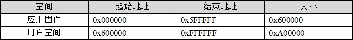 若假设外部NOR Flash的大小为16MB,应用固件的大小为6MB,则此时外部NOR Flash的空间分布,如下表所示: