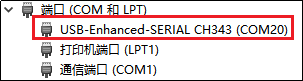 在图5.2.4中可以看到,我们的USB虚拟串口被识别为COM20,这里需要注意的是:不同电脑可能不一样,你的可能是COM4、COM5等,但是USB-Enhanced-SERIAL CH343,这个一定是一样的。如果没找到USB串口,则有可能是你安装有误,或者系统不兼容。