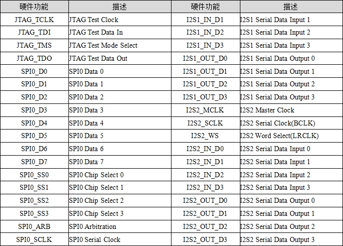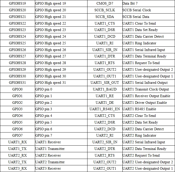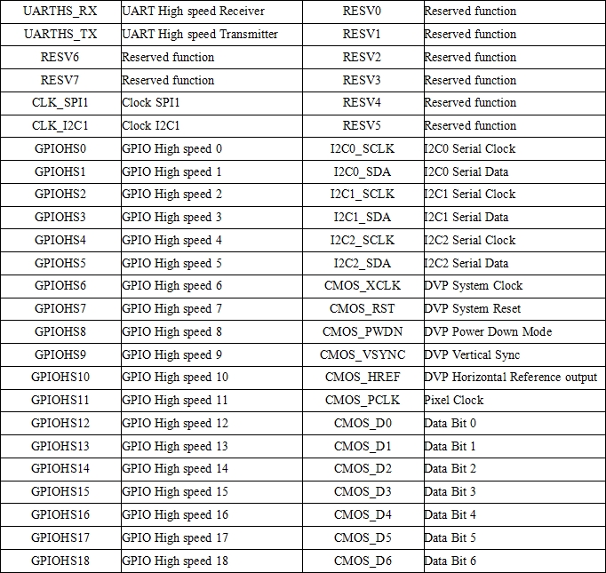 表6.1.1 Kendryte K210 FPIOA硬件功能表
