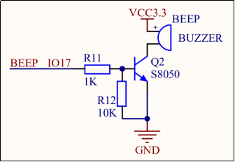 通过以上原理图可以看出,蜂鸣器的发声与否由IO17控制,当IO17输出低电平时,蜂鸣器不发声,当IO17输出高电平时,蜂鸣器发声。
