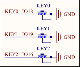 通过以上原理图可以看出,KEY0按键、KEY1按键和KEY2按键对应的IO编号分别为IO18、IO19和IO16,当独立按键没有被按下时,其对应的IO将处于悬空状态,此时读取到的电平将由IO的上下拉决定,当独立按键被按下后,其对应IO的电平将被拉低。