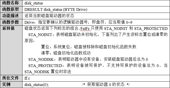 第二个函数是disk_status函数,该函数介绍如表22.1.3所示: