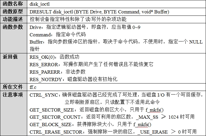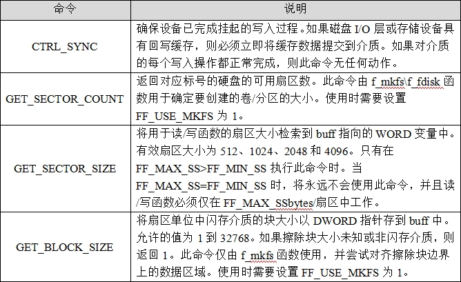 下面是从http://elm-chan.org/fsw/ff/doc/dioctl.html得到的参数实现效果,我们也可以参考原有的disk_ioctl的实现来理解这几个参数。