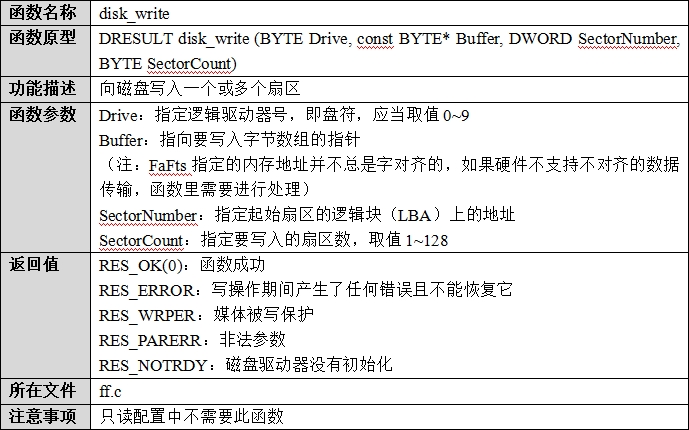disk_write实现直接从硬件接口读取数据,这个接口为FATFS的其它写操作接口函数调用,其声明如下: