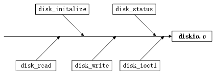 第三步,因为FATFS模块完全与磁盘I/O层分开,因此需要下面的函数来实现底层物理磁盘的读写与获取当前时间。底层磁盘I/O模块并不是FATFS的一部分,并且必须由用户提供。这些函数一般有5个,在diskio.c里面。