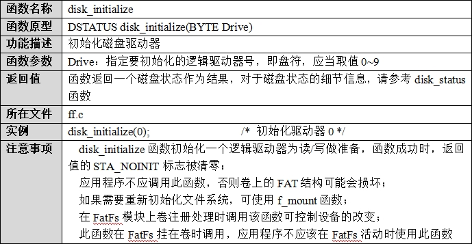 首先是disk_initialize函数,该函数介绍如表22.1.2所示: