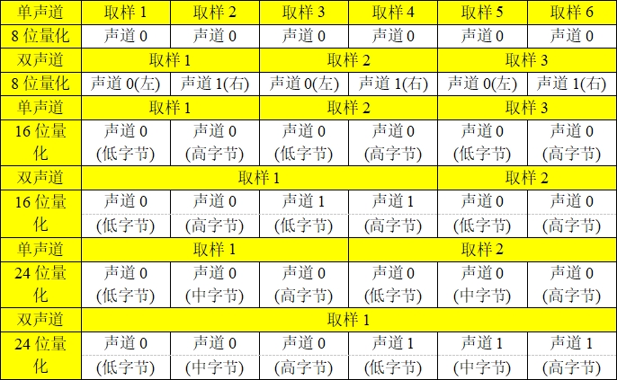 ChunkSize后紧接着就是wav数据。根据Format Chunk中的声道数以及采样bit数,wav数据的bit位置可以分成如表23.1.1.1所示的几种形式: