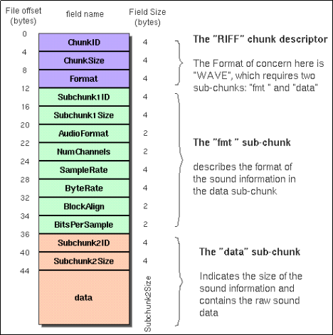 首先,我们来看看RIFF块(RIFF WAVE Chunk),该块以“RIFF”作为标示,紧跟wav文件大小(该大小是wav文件的总大小-8),然后数据段为“WAVE”,表示是wav文件。RIFF块的Chunk结构如下: