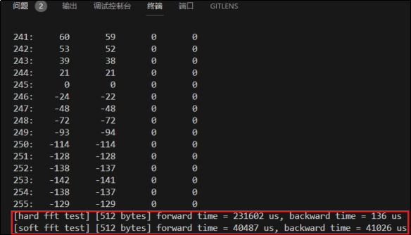 1.程序对一组复数分别使用硬件FFT和软件FFT进行快速傅里叶正变换和快速傅里叶逆变换的运算,并同时记录运行消耗的时间,最后将数据通过串口打印。