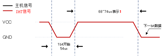 DHT11输出数字‘0’和‘1’时序,一开始都是DHT11拉低数据线54us,后面拉高数据线保持的时间就不一样,数字‘0’就是23~27us,而数字‘1’就是68~74us。