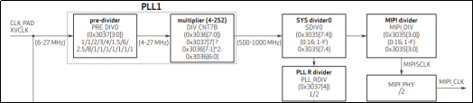 在上表中列出了0x3035、0x3036和0x3037三个时钟配置寄存器,这三个寄存器在整个时钟链路当中的作用如下图所示: