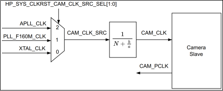 Camera模块时钟由三个时钟源提供,分别是XTAL_CLK、PLL_F160M_CLK和APLL_CLK。可由HP_SYS_CLKRST_PERI_CLK_CTRL19_REG的HP_SYS_CLKRST_CAM_CLK_SRC_SEL位决定,0选择使用XTAL_CLK,1选择使用PLL_F160M_CLK,2选择使用APLL_CLK。