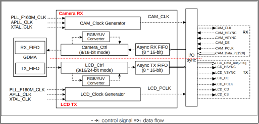 Camera控制模块(红色虚线以上)包括独立的接收控制单元(Camera_Ctrl)、接收异步FIFO(Async RX FIFO)、时钟生成模块(CAM_Clock Generator)和格式转换模块(RGB/YUV Converter)。