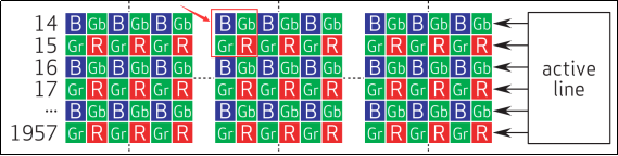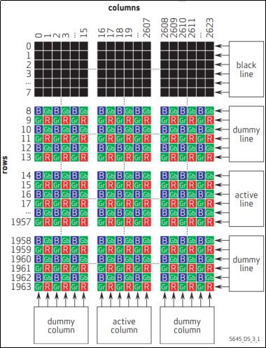 从上图中可以看到整个传感器拥有水平2624垂直1964共计5153536个感光像素点,其中有效感光像素点是水平2592垂直1944共计5038848个像素,也就是图中active区域。在有效显示区域中像素数据是按照Bayer阵列排布的。所谓的Bayer阵列其实就是在上图active区域中像素按照2*2的方格排列,如下图所示: