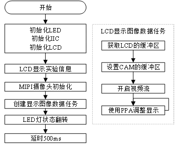 app_main函数比较简单了,主要就是初始化所需外设后,直接调用mipi_cam_init函数,该函数内部会新建一个摄像头显示任务,直接就可以把摄像头数据显示在LCD上了。