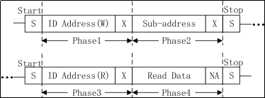 我们可以发现,SCCB和IIC写传输协议是极为相似的,只是在SCCB写传输协议中,第9位为不必关心位,而IIC写传输协议为应答位。SCCB的读传输协议和IIC有些差异,在IIC读传输协议中,写完寄存器地址后会有restart即重复开始的操作;而SCCB读传输协议中没有重复开始的概念,在写完寄存器地址后,发起总线停止信号,下图为SCCB的读传输协议。