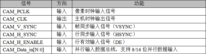 Camera-LCD控制器的CAM和LCD接口都可通过GPIO交换矩阵灵活配置使用任意GPIO引脚。对于CAM模块的信号,即图37.1.2.1右上角部分,在这里也简单介绍一下,如下表所示。