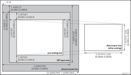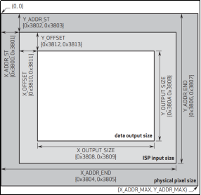 开完窗后还可以通过水平方向和垂直方向的偏移寄存器(0x3810~0x3813)来进一步调整大小,最终输出的图像就上图中白色区域部分。这里大家需要注意一下,在整体图像分辨率水平:垂直=4:3的情况下按上图去配置是可以的,如果是其他尺寸比例那么按上图配置不一定能成功,具体的配置需要原厂协助,我们也没有详细的配置方法或者尺寸计算公式。