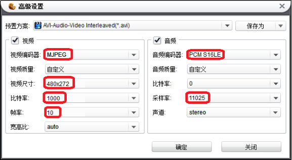 视频编码器:选择MJPEG。本例程仅支持MJPG视频解码,所以选择这个编码器。