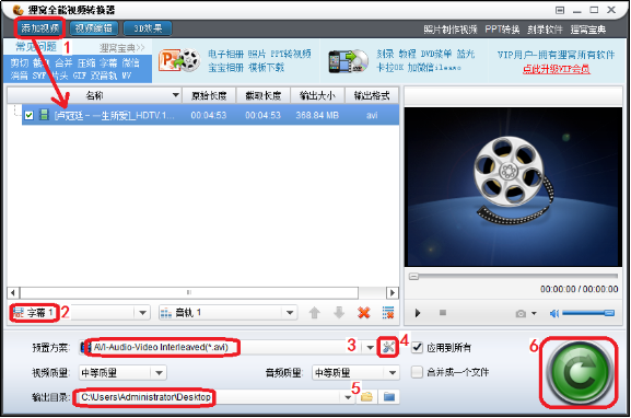 点击图45.4.1的5处文件夹图标,设置转换后视频的输出路径,这里设置到了桌面,这样转换后的视频,会保存在桌面。最后,点击图中6处的按钮,即可开始转换了,如下图所示: