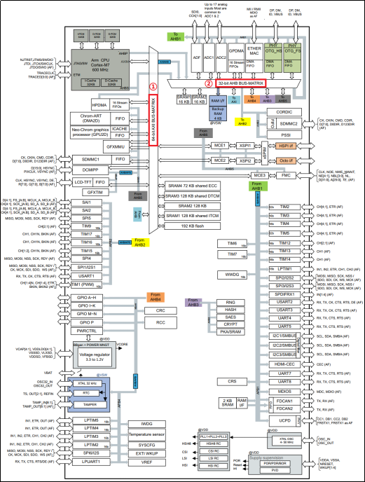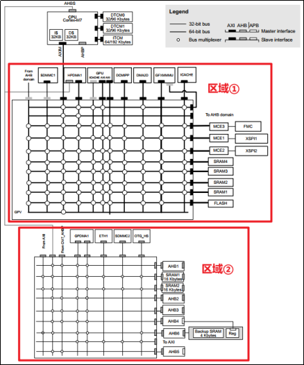 区域①中的各个外设是挂在 64 位 AXI 总线组成 11*10 的矩阵上。11个从接口端外接的主控分别是 SDMMC1、HPDMA1、GPU ICACHE AXI、AXI、DCMIPP、DMA2D、GFXMMMU、ICACHE、AXIM 和 AHB 总线。10 个主接口端外接的从设备分别是AHB 总线、MCE3、MCE1、MCE2、SRAM4、SRAM3、SRAM2、SRAM1和FLASH。