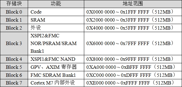 ST将4GB空间分成8个块,每个块512MB,如上图所示,从图中我们可以看出有很多保留区域(Reserved),这是因为一般的芯片制造厂家是不可能把4GB空间用完的,同时,为了方便后续型号升级,会将一些空间预留(Reserved)。8个存储块的功能如表5.3.3.1所示: