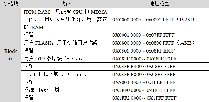 这里我们重点挑前面3个存储块给大家介绍。第一个块是Block 0,用于存储代码,即FLASH空间,其功能划分如表5.3.3.2所示:
