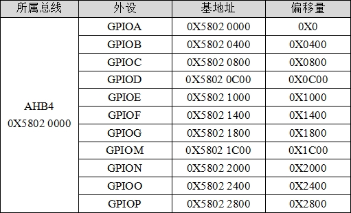 表5.3.4.2 GPIO外设基地址及相对总线偏移量