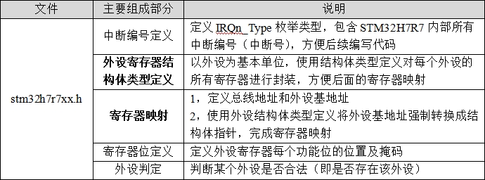 stm32h7r7xx.h文件主要包含五个部分内容,如表5.3.4.4所示: