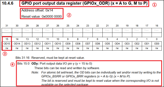 我们以GPIO的ODR寄存器为例,其参考手册的描述如图5.3.4.1所示: