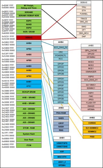 同样可以看到,各个总线之间,都有预留地址空间,方便后续扩展。关于STM32各个外设具体挂在哪个总线上面,大家可以参考前面的 STM32H7R7系统结构图进行查找对应。