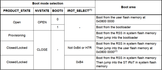 3, 产品状态和芯片运行状态都为Closed/Locked的情况下,BOOT0引脚不起作用,当定时器的设置不为0xB4或者不是H7R的情况,程序从RSS(根安全服务)启动,ST出厂默认的启动地址是0x0800 0000。