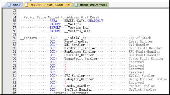STM32H7R7的中断向量表定义代码,如图8.2.2.5所示。