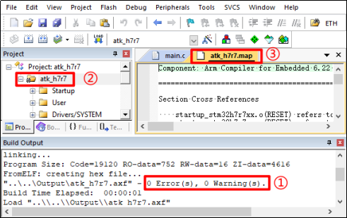 如图8.3.2.1.1设置好MDK以后,全编译当前工程,当编译完成后(无错误),就会生成.map文件。在 MDK 里面打开.map 文件的方法如图 8.3.2.1.2所示: