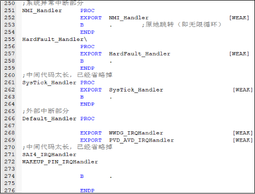 这些中断函数分为系统异常中断和外部中断,外部中断根据不同芯片有所变化。B指令是跳转到一个标号,这里跳转到一个‘.’,表示无限循环。