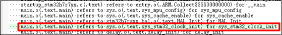 上图中,框出部分: main.o(text.main) refers to sys.o(text.sys_stm32_clock_init) for sys_stm32_clock_init表示:main.c 文件中的 main 函数,调用了 sys.c 中的 sys_stm32_clock_init 函数。其中:text.main表示 main 函数的入口地址,同理 text. sys_stm32_clock_init 表示 sys_stm32_clock_init函数的入口地址。