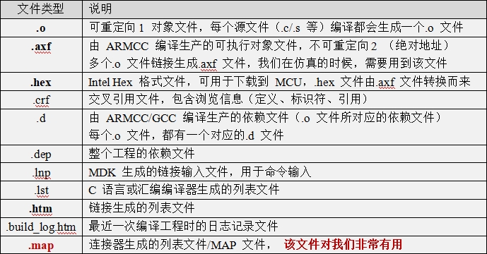 对于 MDK 工程来说,基本上任何工程在编译过程中都会有这 11 类文件,常见的 MDK编译过程生产文件类型如表8.3.1.1所示: