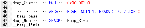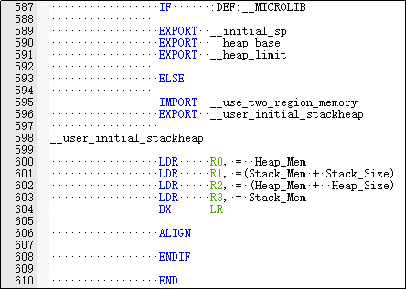 如果定义__MICROLIB,声明__initial_sp、__heap_base和__heap_limit这三个标号具有全局属性,可被外部的文件使用。__initial_sp表示栈顶地址,__heap_base表示堆起始地址,__heap_limit表示堆结束地址。