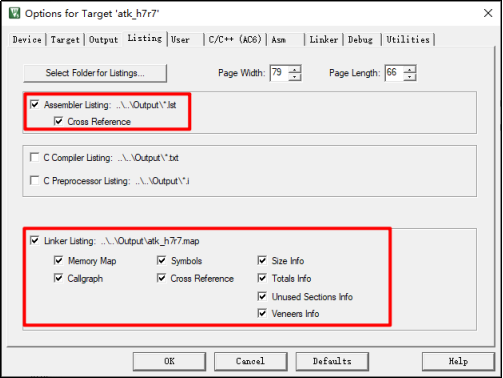 要生成 map 文件,我们需要在 MDK 的魔术棒→Listing 选项卡里面,进行相关设置,如图 8.3.2.1.1所示:
