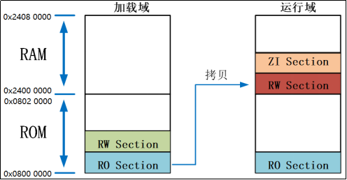 由图可知,RW 区也是存放在 ROM(FLASH)里面的,在执行 main 函数之前,RW(有初值且不为 0 的变量)数据会被拷贝到 RAM 区,同时还会在 RAM 里面创建 ZI 区(初始化为 0 的变量)。